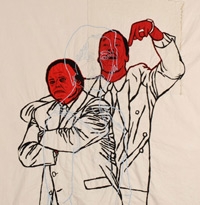 Museum of Contemporary Craft presents the first West Coast exhibition to focus on Darrel Morris’ large-scale embroidery works. While Morris is best known for intimate and nostalgic snapshot-sized pieces – such as the colorful and heavily embroidered and appliqu?d works featured in the Museum’s New Embroidery: Not Your Grandma’s Doily (2006) – the works included in this new exhibition reveal a shift in scale, color and line. The Large Works also signal a departure from autobiographical subject matter to an investigation of the public sphere. Using figures clipped from the print media, Morris' large pieces are line drawings with thread, sharply graphic and monochromatic. Measuring six feet or more, the nearly life-sized imagery envelops and draws the viewer into the work to become an active participant.