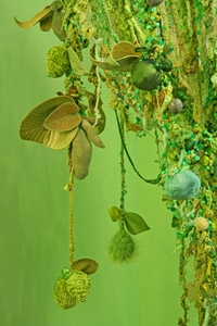 Translated from Italian, “dare alla luce” is an idiomatic expression for giving birth: “to give to the light.” Drawing upon late Renaissance artist Jacopo Tintoretto’s painting The Origin of the Milky Way for inspiration, Greer recounts her own version of the Roman myth in which the milk of Juno’s breast rose to the sky to create the galaxy. Through countless small gestures of her craft, Greer employs humble handicraft processes and materials, executing her work through crochet, braiding, sewing and beading processes that use yarn, beads, shells, feathers and more. Merging the mythical and the mundane, Greer collapses the language and materials of the ordinary with the spectacular and the epic. The resulting work intertwines objects and space, resulting in an exuberant, sensual and visceral installation.