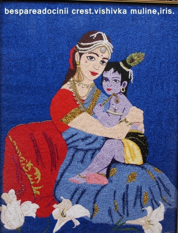 Картина вышита собственным стилем - беспорядочный крестик. Название: Кришна на руках матери Йашоды. Нитки: мулине, ирис, шерсть, бисер. Размер вышивки без рамы: 34 на 44 см. Рама массивная. Картина закончена. На электронный адрес могу выслать все фотографии картины.