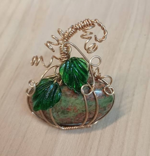 A unakite cabochon and bronze wire created this handsome pumpkin. Adored with green glass leaves. Contains a handmade pin back. Such a special piece to add to your autumn jewelry collection.