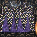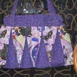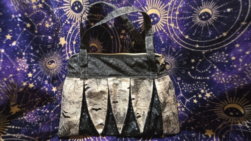 I used 2 yards of fabric to make the shoulder. bag. I used bats & spider webs halloween themed fabric as my main pattern. The accent fabric is a black gothic pattern. The inside of the bag I used a silver blue color. The bag has two pockets on the inside.