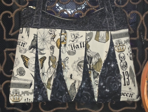 I used 2 yards of fabric to make the shoulder. bag. I used halloween themed fabric as my main pattern. The accent fabric is a black gothic pattern. The inside of the bag I used a silver blue color. The bag has two pockets on the inside.