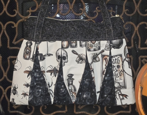 I used 2 yards of fabric to make the shoulder. bag. I used halloween poison bottles and skulls themed fabric as my main pattern. The accent fabric is a black gothic pattern. The inside of the bag I used a silver blue color. The bag has two pockets on the inside.