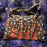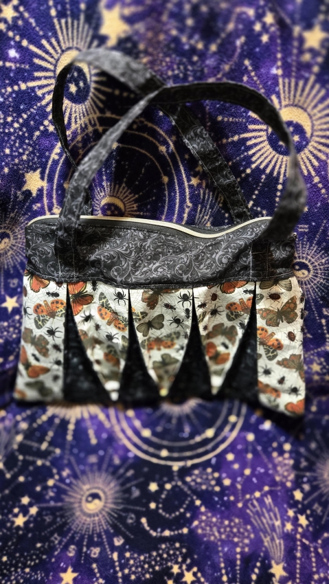 I used 2 yards of fabric to make the shoulder. bag. I used halloween moths themed fabric as my main pattern. The accent fabric is a black gothic pattern. The inside of the bag I used a silver blue color. The bag has two pockets on the inside.