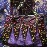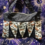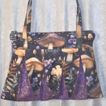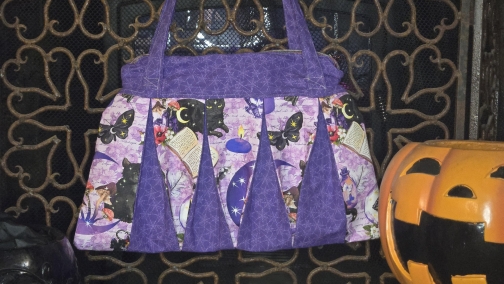 I used 2 yards of fabric to make the shoulder. bag. Halloween black cat themed fabric as my main pattern. The accent fabric is a purple spider web. Honey he's okay pattern. The inside of the bag I used a silver blue color. The bag has two pockets on the inside.