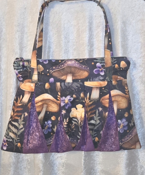 I used 2 yd of fabric to make the bag. I used Mushroom as the main pattern of fabric. The accent fabric is a purple. The inside of the bag is purple color as well. You have 2 pockets on the inside of the bag. I used a pleated style for the bag. It makes the bag open up to 10 inches wide. Plenty of room to fill your bag with anything of your stuff.