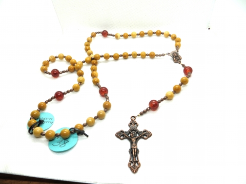 This rosary is made with mookaite beads which is Australian jasper - so pretty. There is a copper crucifix and Mary centerpiece. The beads are strung on wire.
