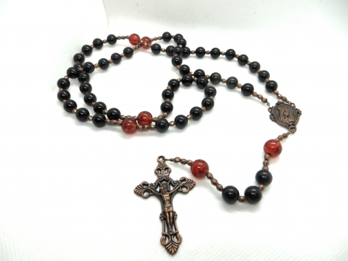 This rosary is handsome with black obsidian beads strung on wire. There is a copper crucifix and Mary centerpiece. The black is very handsome with the copper. # 56