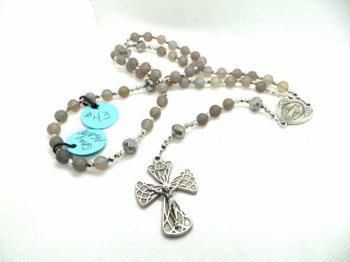 This rosary is made with gray matte agate beads. There is a silvertone crucifix and Mary centerpiece. The beads are gray and look pretty with the silver. #43