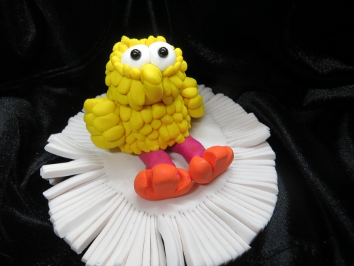 Baby big bird is ready for a party! He is made from polymer clay which has plastic and resins making him strong. 4 1/2" round Over time he might need repair - use a super glue gel for best results. My sculptures are unique, one of a kind, no two the same. They are made for mature children to adults. They are semi fragile and are to be handled with care.