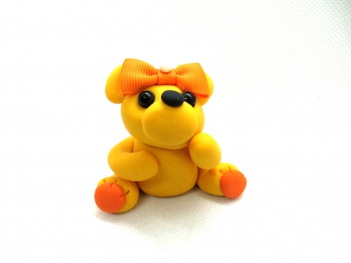 She is so cute with her orange bow. She measures 2"x2 1/2" and is made from polymer clay which has plastic and resins making her strong. Over time she might need repair - use a super glue GEL for best results. My sculptures are unique, one of a kind, no two the same. They are made for mature children to adults. They are semi fragile and are to be handled with care.