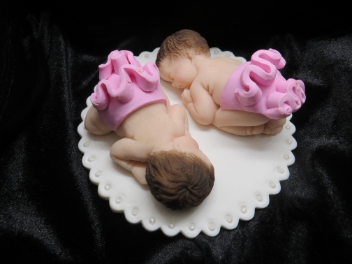 These twin girls are dressed in pink rompers and are on a white base with scalloped edges with pearls. The base measures 4 1/2 inches and they are made from polymer clay which has plastic and resins making them strong. Over time they might need repair - use a super glue gel for best results. Make an ordinary everyday cake - extraordinary for little cost and have a keepsake after. Use wax paper or similar under the topper when placing on the cake.....topper can be cleaned with water.