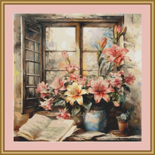 This cross stitch pattern depicts a picture of a beautiful bouquet of flowers on a window sill.