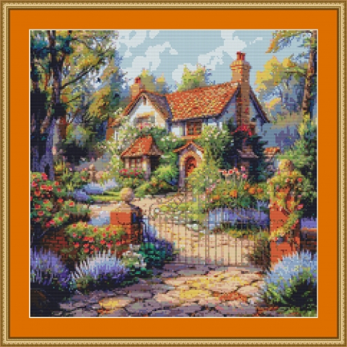 This cross stitch pattern depicts a picture of a pair of wrought Iron gates in front of a beautiful garden surrounding a charming house.