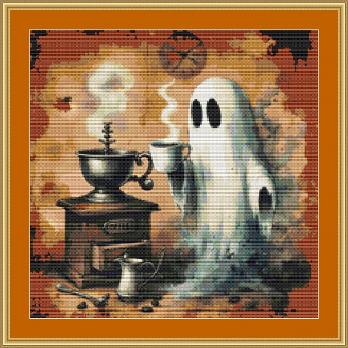 This cross stitch pattern of a ghost with a mug of coffee he has made.