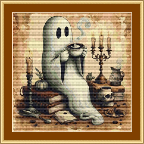 This cross stitch pattern of a ghost sat on some books, with steam coming from a mug of coffee he has made.