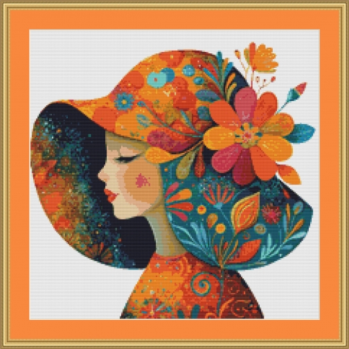 This cross stitch pattern of a woman wearing a colourful hat covered in patterns with some flowers on it.