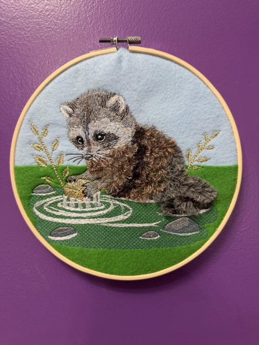 This detailed handcrafted embroidery features a curious baby raccoon gently pawing at the water’s surface, captured mid-moment in a peaceful woodland scene. Rich textured stitching brings the raccoon’s soft fur to life, while layered embroidery creates rippling water, smooth stones, and grassy banks. Delicate wheat and natural tones add warmth and depth to the background.