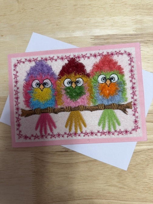 This cheerful handmade greeting card features three fluffy embroidered birds perched side by side on a branch, stitched in bright, playful colors. Each bird has a textured, fuzzy finish that gives the design a soft, whimsical look, while expressive eyes and tiny beaks add personality and charm. A decorative stitched star border frames the scene, all mounted on a soft pink card base.
