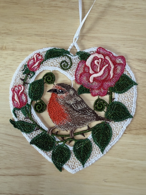 Robin & Roses Lace Heart Ornament – Embroidered Bird Valentine o