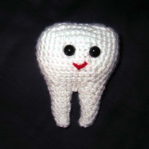 Pattern requires acrylic yarn and a 3.5mm crochet hook, post eyes and scrap of fabric for the pocket. The tooth is 4 inches tall and 3 inches wide. A 2x2 inch fabric lined pocket is hidden in the back.