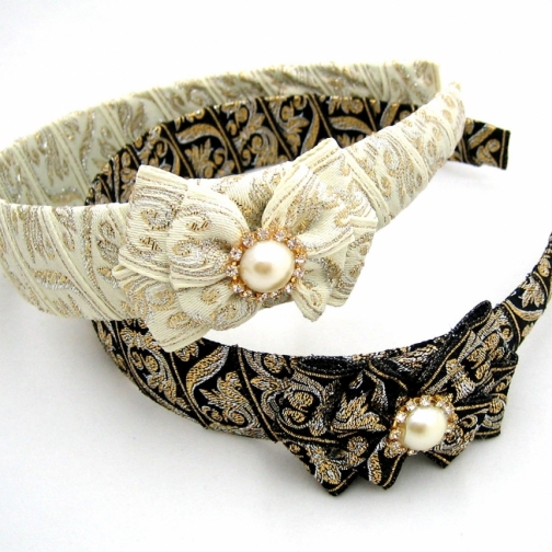 Jacquard silk fabric wraps around an 1.25 inch thick band, and Layers of twin ribbons accented with pearl and cubics in the middle decorate the band.